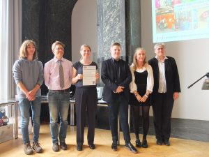Unsere Schule gewann einen mit 1.500,- Euro dotierten Hauptpreis (4. Platz). Dieser wurde von drei Schülervertreterinnen und -vertretern – Paul Schulte für das BioLAB, Keith Rosier für die Energiemanagerinnen und -manager, Kim Wibbelhoff für die Kampagne Fairtrade Schools – sowie zwei Projektlehrkräften, Erik Breves und Birgit Krewer, im Mosaiksaal entgegen genommen.