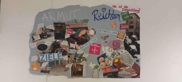Der achte Jahrgang, der sich schon im letzten Jahr mit dem Bereich Nachhaltiger Konsum befasst hat, hat das folgende Jahr genutzt, um weitere Bereiche zu bearbeiten, die in den einzelnen Klassen zu kurz gekommen ist. Als Ergebnis ist eine tolle, umfassende Wandzeitung entstanden, die sich mit Themen wie Kakao-(Schokoladen-) und Kaffeeproduktion, Fair Fashion, Fair Trade, Rechten von Frauen und Kindern und Smartphoneproduktion beschäftigt. Dabei sind kreative Videos entwickelt worden, Comics, eindrückliche Zeichnungen, sowie zum Beispiel eine beGREIFbare Lieferkette, die einmal mehr zeigten, wieviel kreatives Potential in unseren Schülern steckt. Eine Verlinkungen der Ergebnisse per QR-Code sowie eine visuelle Rückbindung an die 17 Ziele auf den Plakaten rundete das Ergebnis ab. Zur Zeit ist diese Wandzeitung noch im Jahrgang 8 zu bewundern.