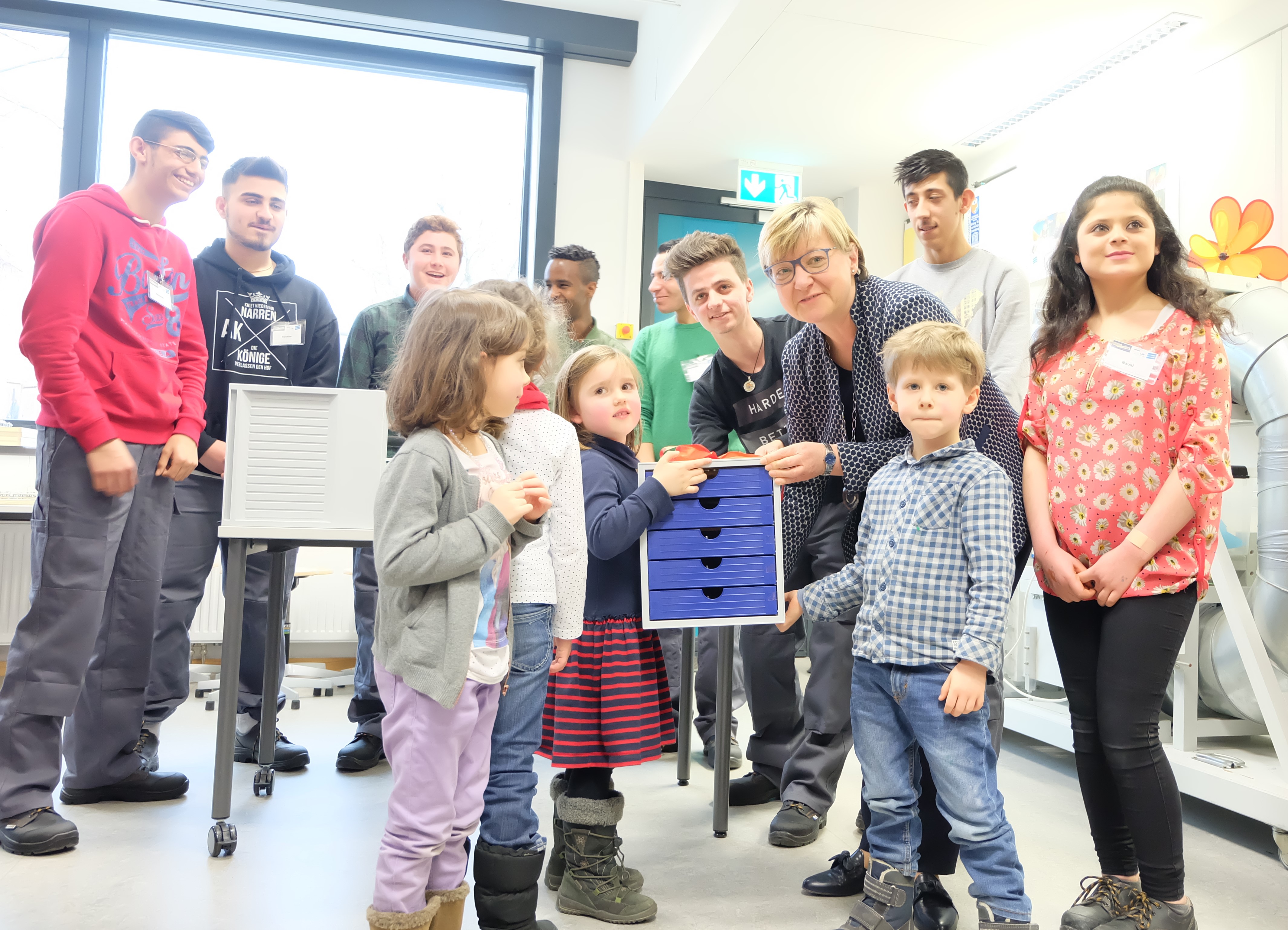 Am 09.03.2017 konnten die acht Projektteilnehmer der Kooperativen Produktionsschule mini-Solar zusammen mit der Kultusministerin Frauke Heiligenstadt ihre ersten Kunden beliefern: die Kita Edenstraße. Die sechs Schüler aus den Sprachlernklassen und den Jahrgängen 9 und 10 und die zwei Teilnehmer vom JobCenter hatten die Sets in den vergangenen Wochen gebaut und dabei einen ersten Einblick in die Elektrotechnik bekommen. Zusätzlich lief ein MINT-Begleitprogramm.