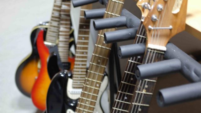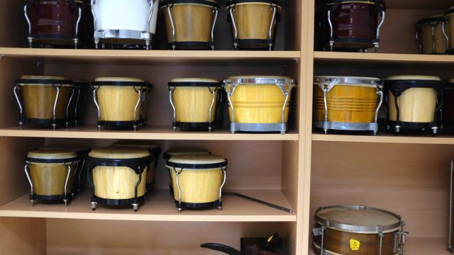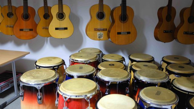 In den zwei Instrumentensammlungen befinden sich zahlreiche Instrumente für die Musikpraxis: Keyboards, Gitarren, Xylophone und Congas, Percussion, orffsche Instrumente wie Glockenspiele, Rasseln, Klanghölzer, etc.. Außerdem stehen in den Räumen Bandinstrumente wie E-Gitarren und E-Bass mit Verstärkern, Mikrofone und Schlagzeug.