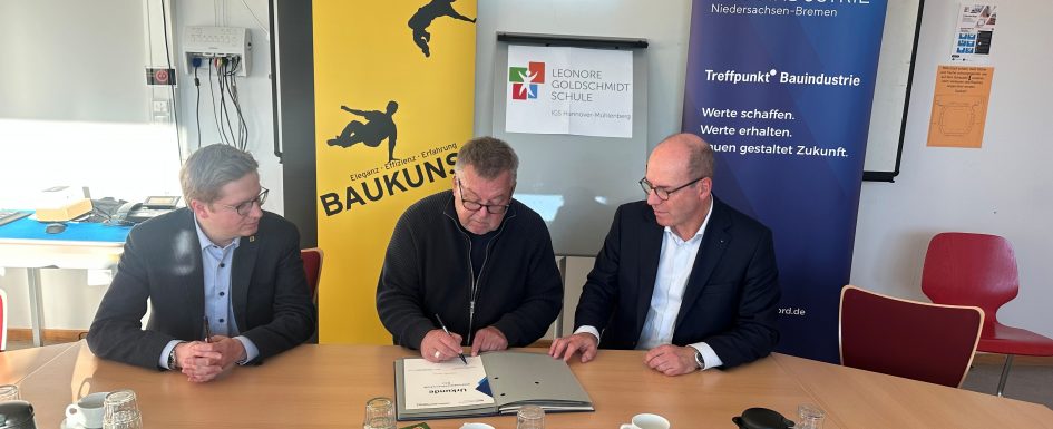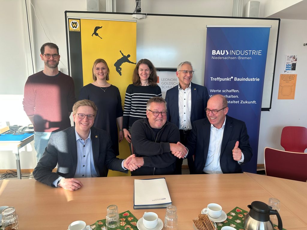 Am 15.12.2025 wurde die Urkunde über die Vereinbarung einer Bildungspartnerschaft zwischen unserer Schule und dem hannoverschen Bauunternehmen Wilhelm Wallbrecht GmbH & Co. KG offiziell unterzeichnet. Diese innovative Kooperation wurde vom Bauindustrieverband Niedersachsen-Bremen initiiert. Großes Ziel ist es, den Fachkräftenachwuchs in der Bauwirtschaft zu sichern, indem eine enge und verlässliche Zusammenarbeit zwischen dem Unternehmen Wallbrecht und der Leonore-Goldschmidt-Schule stattfindet.